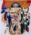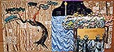 Jim Hay is an American artist dealing with the limited working space of his small Japanese house. Kimonos and easily rolled up scrolls point the way toward fabric assemblage as a solution suitable for our global village. It is clean, needs few tools, offers all the colors of the world's cloth and can be rolled up for storage and easy shipment abroad.